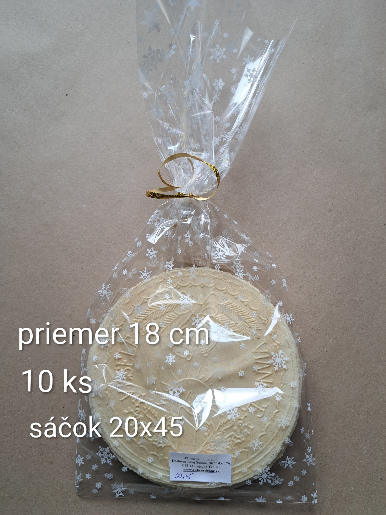 Materiál sáčkov je PP - polypropylénová fólia, na Slovensku známa aj ako celofán, avšak upozorňujeme, že nejde o originál celofánu. Sáčky určené na balenie hotových výrobkov určené aj na styk s potravinami. Fólia je priezračná s potlačou, s vysokým leskom, takže produkty, ktoré do sáčkov budete baliť budú jasne žiariť. V balení sa nachádza 10 ks.