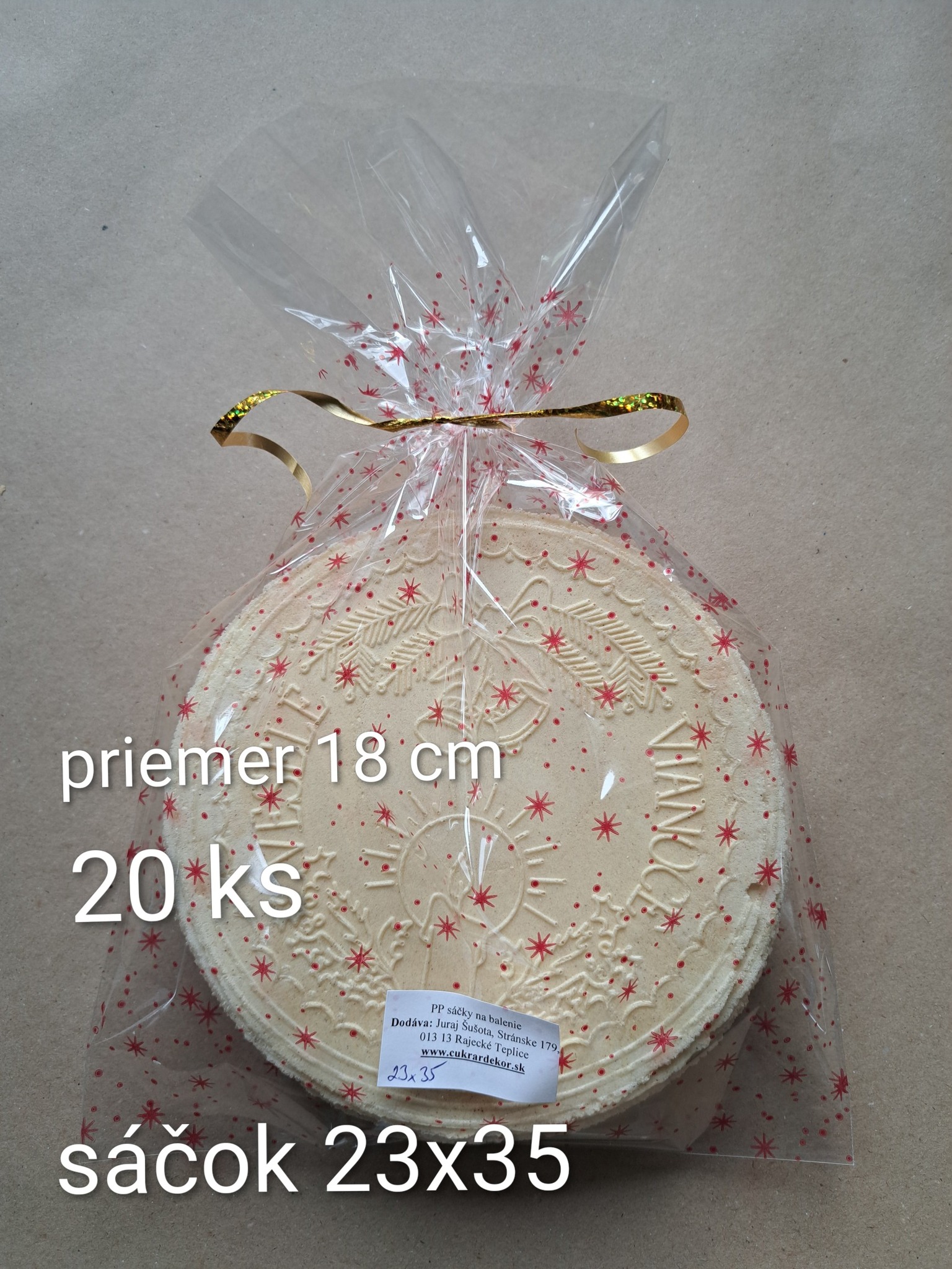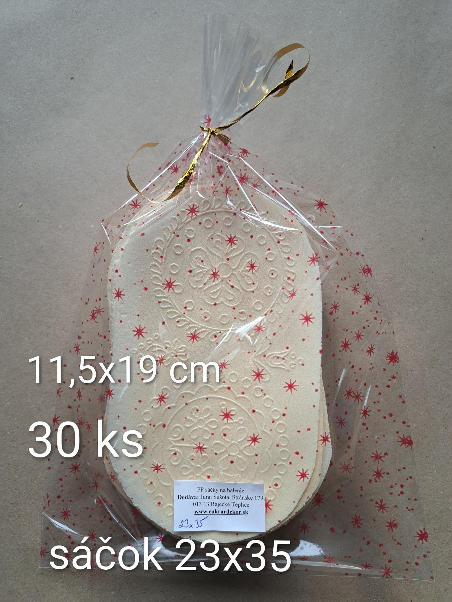 Materiál sáčkov je PP - polypropylénová fólia, na Slovensku známa aj ako celofán, avšak upozorňujeme, že nejde o originál celofánu. Sáčky určené na balenie hotových výrobkov určené aj na styk s potravinami. Fólia je priezračná s potlačou, s vysokým leskom, takže produkty, ktoré do sáčkov budete baliť budú jasne žiariť. V balení sa nachádza 10 ks.